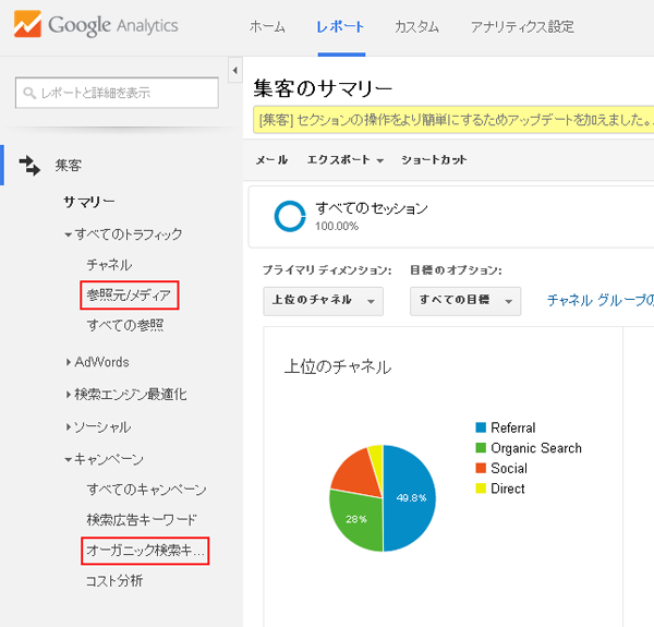 トップ > ウェブ解析 > Googleアナリティクスの集客メニューが変わりました。 2015/01/09 後で読む 今までの【すべてのトラフィック】は、【すべてのトラフィック】の中の【参照元/メディア】に変わり、【オーガニック検索】は、【キャンペーン】の中に入りました。 画像をクリックすると拡大します 使い勝手はそんなに変わらないのですが、画面キャプチャを使ってセミナーや講座などの資料を作っている方は、修正が大変ですね(>_<) そのうち有料しか使えなくなるとかは困ります。。。 関連記事 - こちらもどうぞ大阪大学中之島センターにてセミナーを行いました。ネットショップを立ち上げましたGoogle Analytics 実践講座へ - ウェブ解析 すべてのトラフィック, オーガニック検索, 参照元/メディア Tweet 前のページへ buttons-for-website.com からの不明なアクセス 次のページへ 「ビジネス活用できる動画」セミナーへ